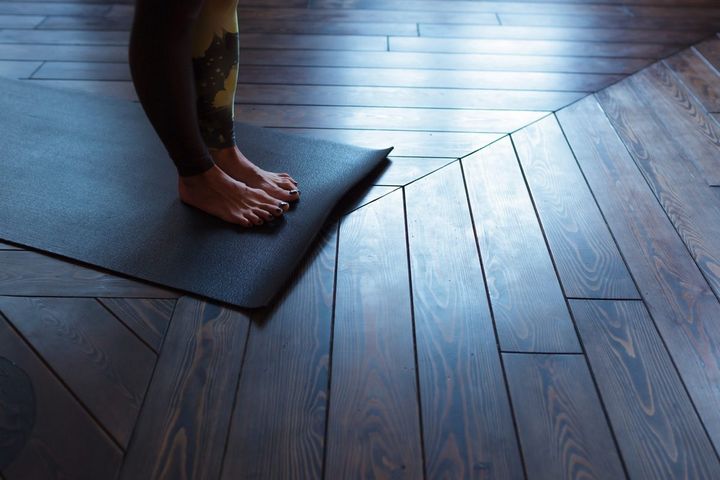 まっすぐに立って、カカト同士をつけ、つま先は左右に90度になるように開く。この時、両脚の膝やふくらはぎの一部がつかない場合は、骨盤が開きすぎている可能性が高い。