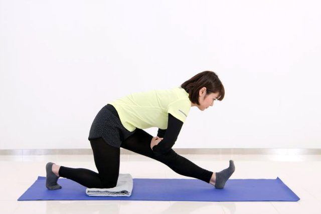 (1)床に敷いたタオルの上にひざ立ちになって、片方の脚を大きく前に出す