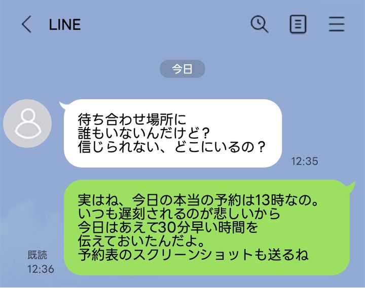 「実はね、今日の本当の予約は13時なの。いつも遅刻されるのが悲しいから、今日はあえて30分早い時間を伝えておいたんだよ。予約表のスクリーンショットも送るね」