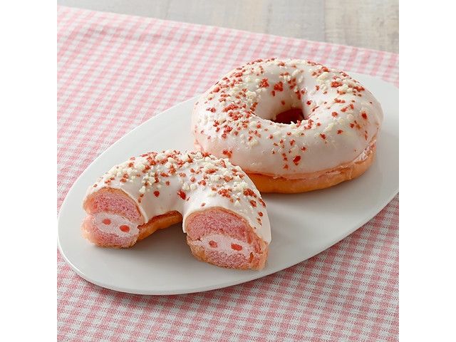 ピンク色のドーナツ生地にいちご果肉入りミルクホイップをサンドし、上からホワイトチョココーティングと2種類のクランチをトッピングしました。