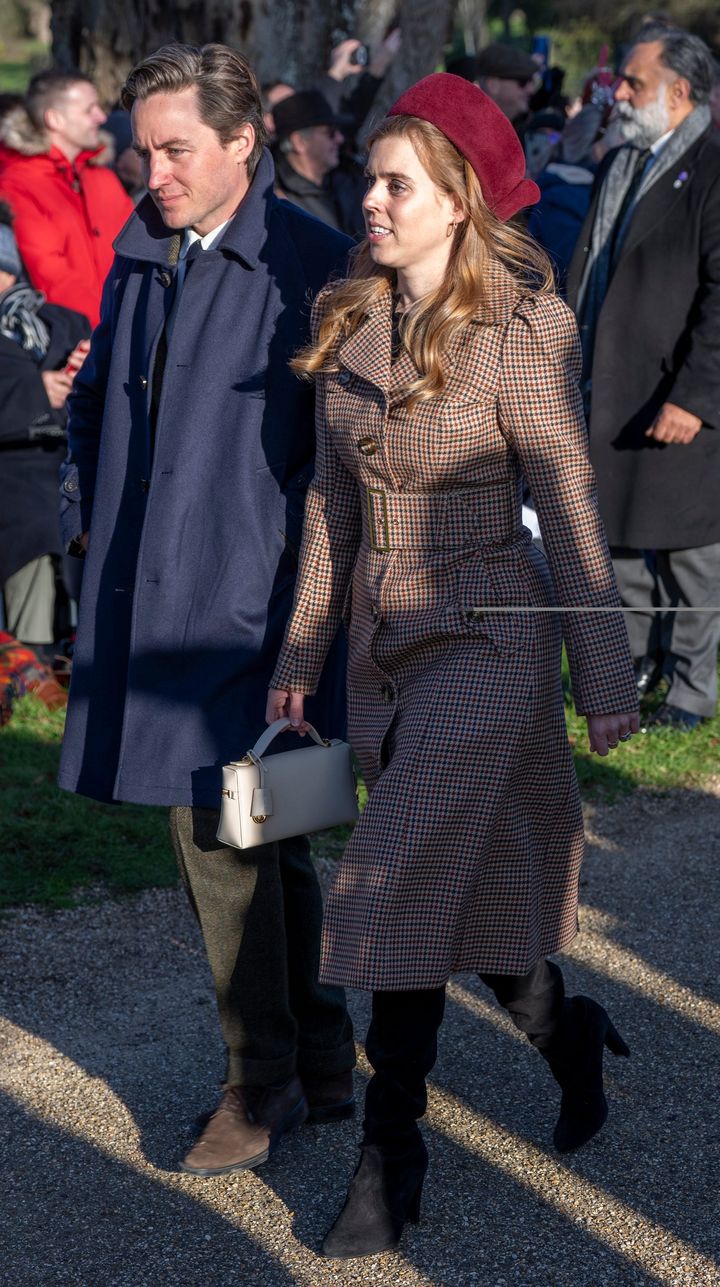 クリスマスの朝、ロイヤルファミリーと礼拝に向かうユージェニー王女。後ろにはベアトリス王女夫妻の姿も見える。ユージェニー王女(Princess Eugenie) Samir Hussein / Getty Images