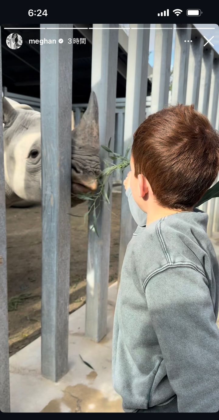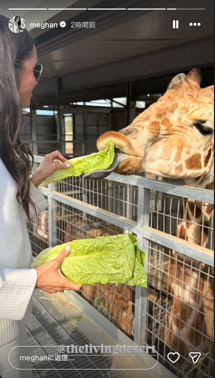 これに続いて妃はインスタグラムのストーリーも更新。子どもたちと一緒に動物園「ザ・リビング・デザート・ズー・アンド・ガーデンズ」に遊びに行った様子をシェアした。サイに餌をあげるアーチー王子の後ろ姿を捉えている。リリベット王女の姿はないが、代わりにキリンに野菜を食べさせる妃の姿を捉えた1枚が公開されている。