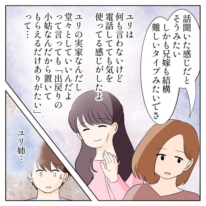 「話聞いた感じだとそうみたい、しかも兄嫁も結構難しいタイプみたいでさ・・・」ユリ姉は何も言わないけど、電話してても気を使ってる感じがしたと姉ちゃんは言います。ユリの実家なんだし堂々としてていいんだよと伝えても、「出戻りの小姑なんだから置いてもらえるだけありがたい」と控えめな姿勢を崩さなかったそうです。