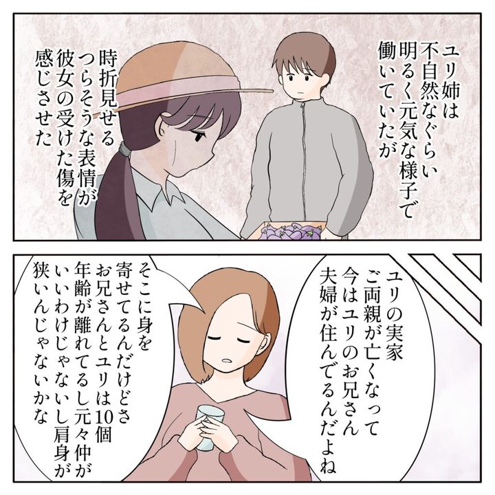 ユリ姉は不自然なくらい明るく元気な様子で働いていましたが、時折見せるつらそうな顔が、彼女の受けた傷の深さを感じさせました。俺はユリ姉のそんな姿を見て、姉ちゃんの言葉を思い出します。「ユリの実家、ご両親が亡くなってて、今はお兄さん夫婦が住んでいる家に身を寄せてるらしくて、お兄さんとは元々仲がいいわけじゃないみたいで肩身が狭いんじゃないかな」