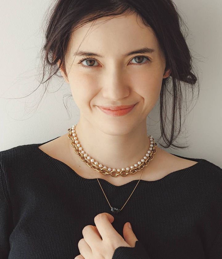 パールネックレス〈SV×YGプレーティング×淡水パール〉¥28,600チェーンネックレス〈SV×YGプレーティング〉¥132,000(ともにマユ/マユ ショールーム)コウモリモチーフネックレス〈YG×ブラックマーブル×ホワイトコーラル〉¥92,400(アリータ/ブルーベル・ジャパン)ニット¥20,900(ポム アムステルダム/ジャック・オブ・オール・トレーズ プレスルーム)