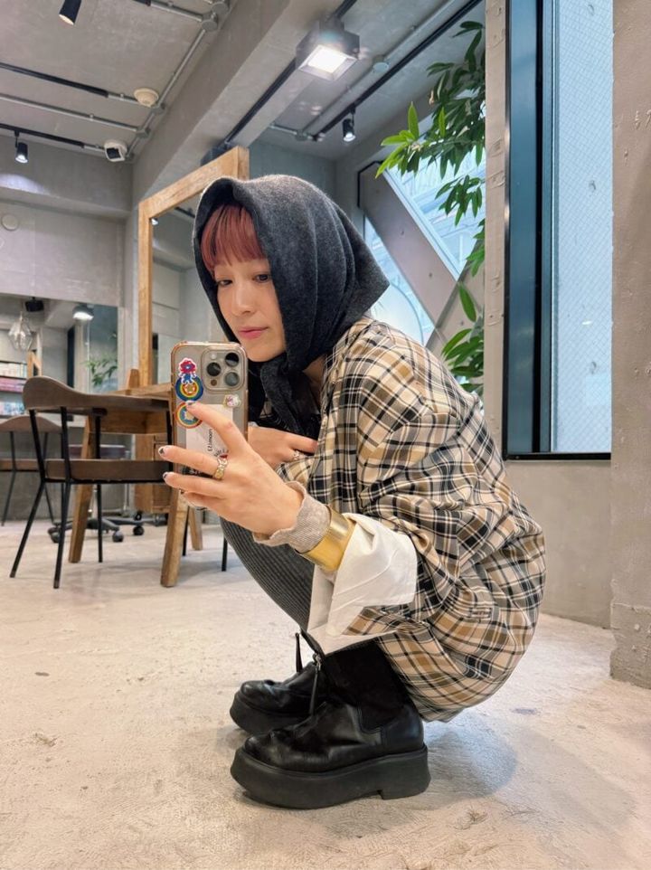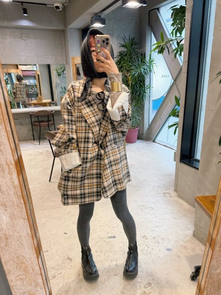 「派手派手なチェック柄がお気に入りのジャケットはCLANEのもの。メインで使いたかったので、ほかのアイテムはシンプルなものをチョイス。ボリューム感のあるバングルやショートブーツをあわせて、バランスをとりました!」(ヘアサロンPARKオーナー・水戸怜子さん)