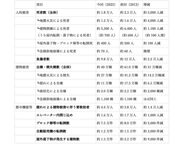 最新の被害想定(2025年公表)と前回(2013年公表)の比較データを表にまとめています。