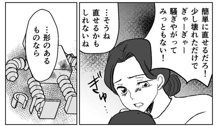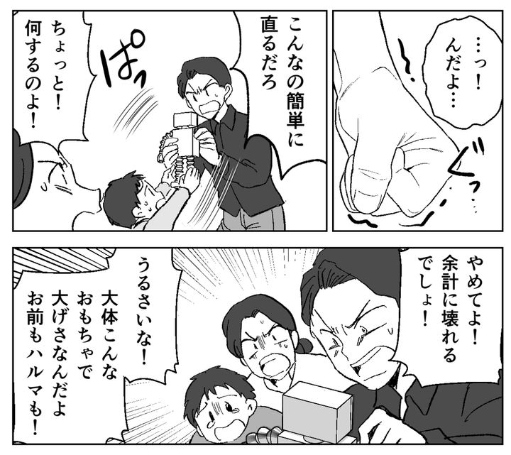私が激しく詰め寄ると、夫は何も言い返しません。夫はハルマの方に目をやると、泣き続けるハルマの手から壊れたロボットの工作を奪い取るように掴みました。