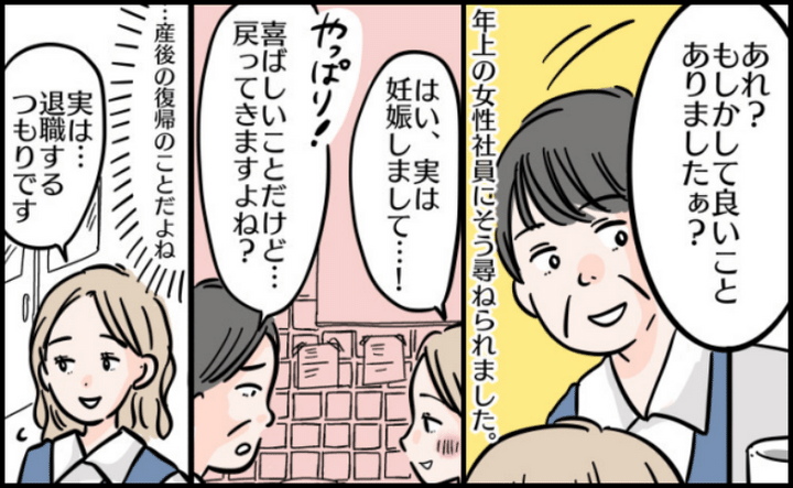 「喜ばしいことだけど……戻ってきますよね?」。女性社員は妊娠を祝福してくれたものの、人が減るのはごめんといった表情。私は言いにくさを感じながらも、退職の意向を打ち明けました。