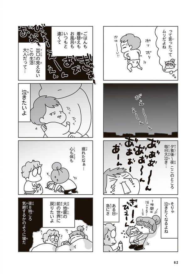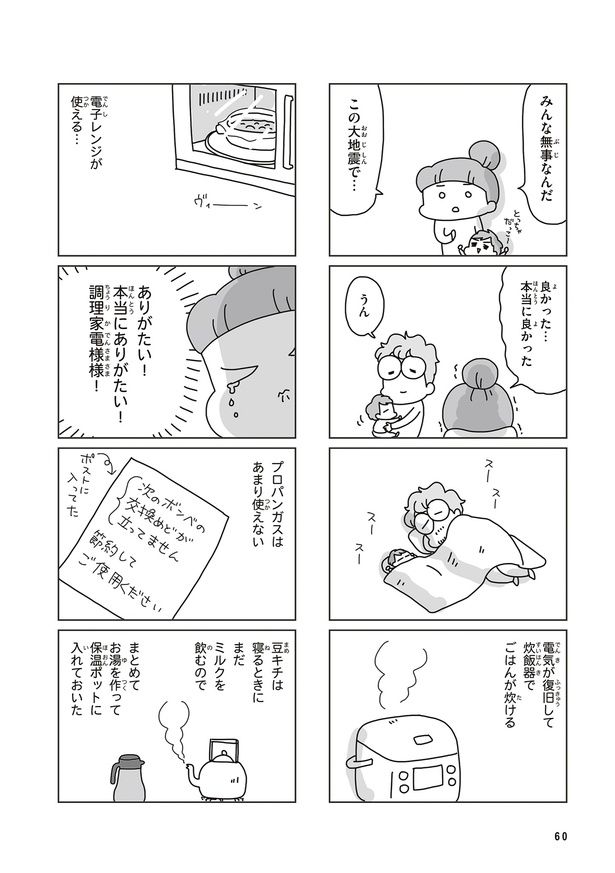 東日本大震災で、突然日常を奪われた1歳の息子と20代の夫婦。子の夜泣きやアレルギーなどから避難所生活をあきらめ、自宅避難で乗り越えることに――。この地震大国で、実は意外と多いかもしれない自宅避難者。その日々を知ってもらうことで、防災の備えの大切さを一人でも多くの人に知ってもらえたら…。世界がひっくり返るような地震が起きても、人間はお腹も減るしトイレにも行きたくなるし、赤ちゃんは夜泣きする。混乱しながらも続けた自宅避難生活。3月11日から4月1日までの中間被災者のリアルを綴った実録コミックエッセイ『今日、地震がおきたら』をお届けします。