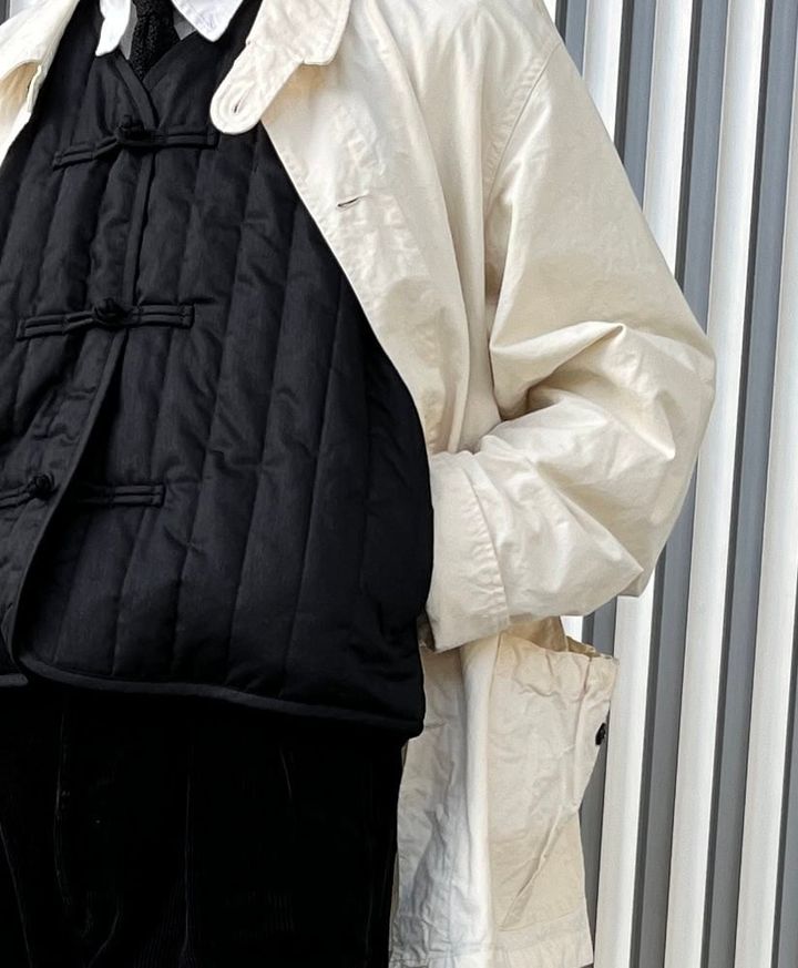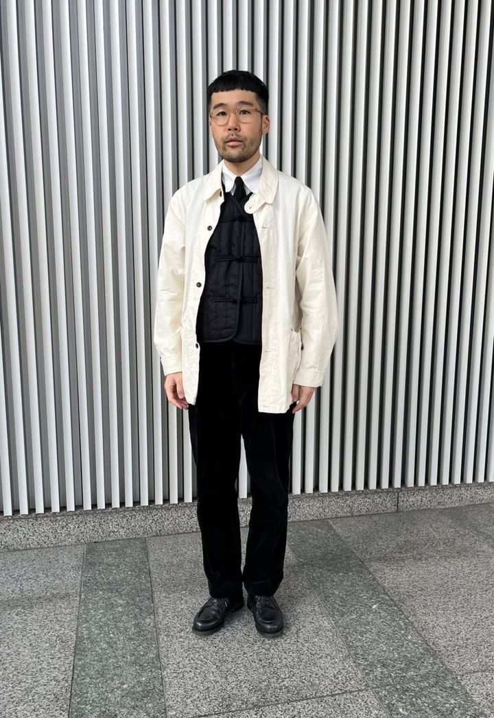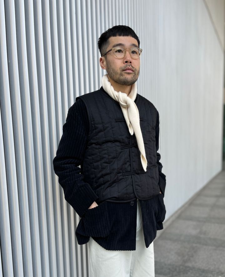 ジャケットの上にチャイナベストを羽織るテクニックも披露してくれました! 「キルティングなのでアウトで使ってもサマになるのも、このベストの推しポイント。個人的にキルティングはコーデュロイと相性がイイと思っているので、今回はかなり太畝のコーデュロイジャケットをセレクトしてみました」同じ黒でも素材感がここまで違うと、奥行きのあるレイヤードに仕上がるというのも発見でした! このテクニックも参考にさせていただきます!