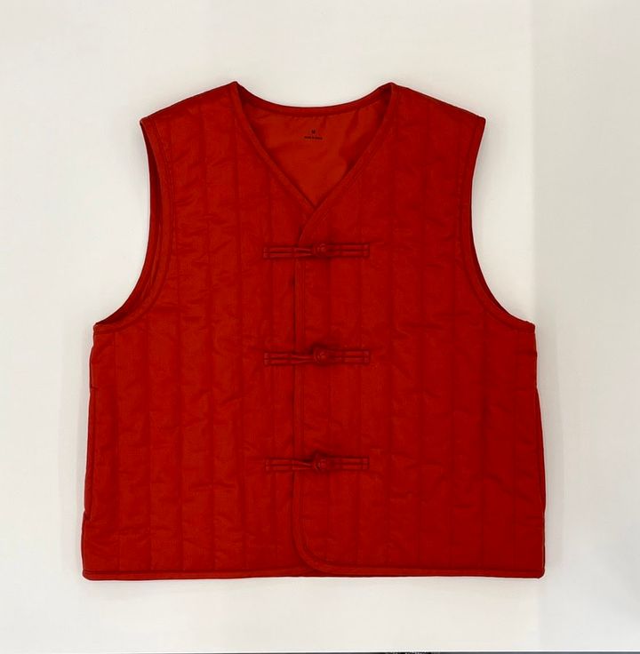そもそもこんなに洒落たチャイナベストが【無印良品】にあったことに驚いたのですが、どうやら前立てにチャイナを採用したアイテムは定期的に展開しているそう。安武さんもひと目ボレだったそうで、「先日伺った展示会で、一番欲しいと思ったアイテムがこのベストだったんです」。安武的お気に入りポイントがいくつもあったようなので、まずはそちらを詳しく解説していきます。