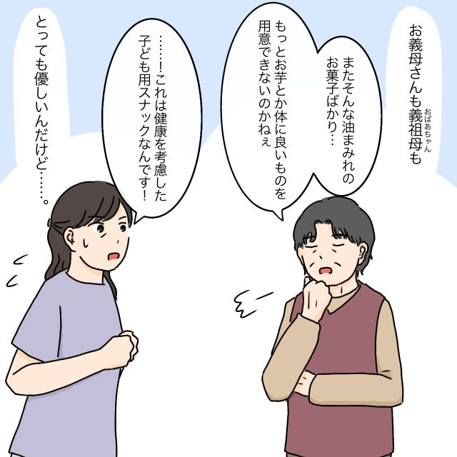 義母がゆうたに用意してくれたおやつを見た義祖母が「またそんな油まみれのお菓子ばかり。」と文句をつけだしたのです。「もっとお芋とか体に良いものを用意できないのかねぇ」と独り言のように、それでもはっきりと義母に向けて言うと、「これは健康を考慮した子ども用スナックなんです!」と義母が反論しました。