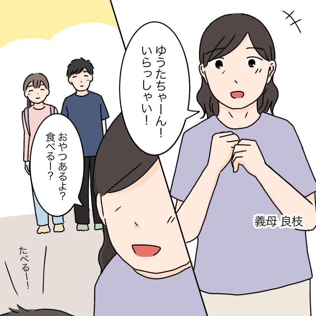 義実家に到着すると、さっそく笑顔の義母、良枝さんが出迎えてくれました。ゆうたの到着を楽しみにしてくれていたようで、「おやつあるよ?食べるー?」と嬉しそうです。