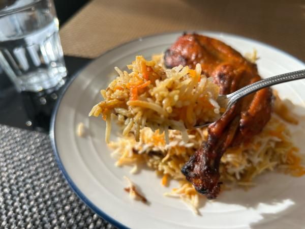 鼻の穴を抜けるなんとも良い香り!旨味と香辛料がまばらにバスマティライスと一緒になっていて、フワッと空気と一緒に心地よい香りが口の中一杯に入っていきます。タンドリーチキンは、途中までスプーンでほぐしながら一緒に頂き、最後はペーパーを巻いて手づかみでかぶりつきました。見た目はボリューム満点ですが、日本のお米よりも軽い食感なのでスッとお腹に入っていきます。