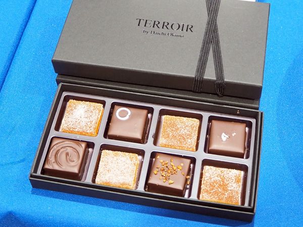 「TERROIR by Daichi Okuno」の「TERROIR FUKUI 8(ボンボンショコラとパートドフリュイ)」は、シェフの故郷・福井県の素材を集めたボンボンショコラとパート・ド・フリュイ(黄金梅)のBOX。蕎麦のプラリネ、日本酒、結晶塩、シェフの実家の庭の木から手摘みされた山椒などを使った、土地の香りと個性が堪能できるセットです。