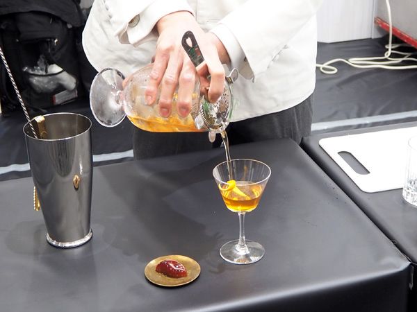 発表会の会場でも実演があった「SUKIYABASHI SAMBOA」の「ベルベットアンバー(カクテル)×樽バニラ(チョコレート)」は、カクテルとチョコのセット。
