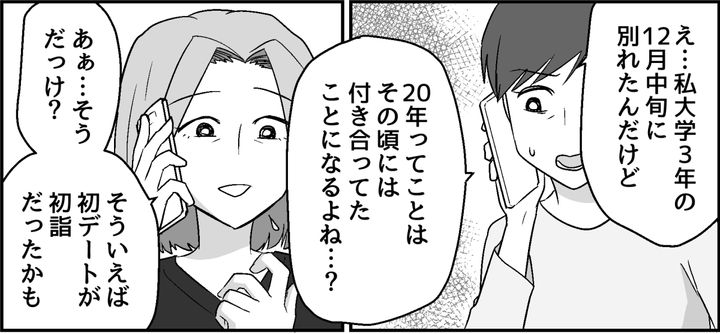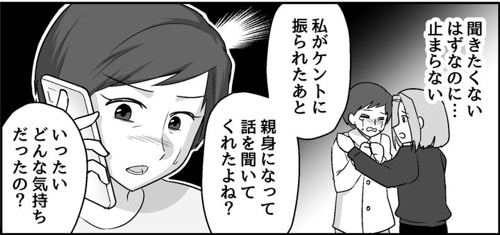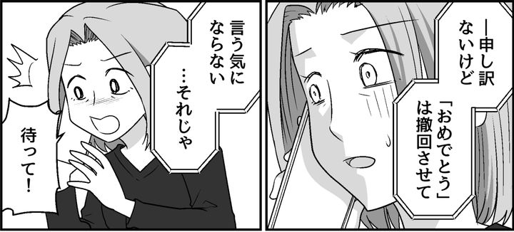 私がケントと別れたのは、大学3年生の12月中旬。エイコによると、ケントとの初デートがその翌月の初詣。ちょうど私がケントと別れて深く傷つき、エイコが懸命になぐさめてくれていた時期です。しかもエイコは「ケントに告られても最初は断っていた」と言います。それって私がまだケントと別れる前のこと? 私が別れたからあっさり付き合ったの? あまりの衝撃に私は言葉を失い、ついには「おめでとう」を撤回したのでした。