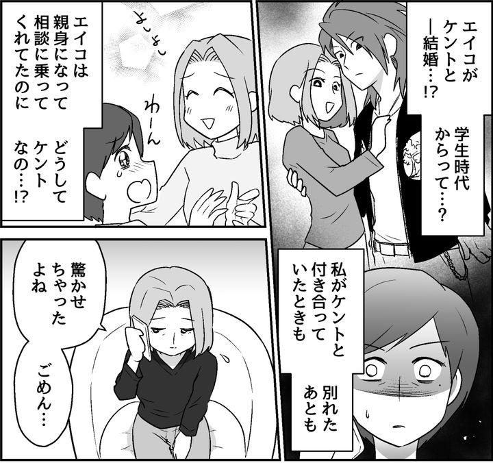 私はカオル。20代半ばで夫と結婚し、現在は娘と息子と4人で暮らしています。子どもたちが大きくなり、ここ数年は学生時代の友人エイコともたまに会っています。エイコは、私が元カレのケントと破局して泣き崩れていたときに、懸命に支えてくれた大切な親友です。ある日エイコから「結婚しました」という連絡が来ました。しかしその相手がケントと聞かされ、私はアゼンとしてしまいます。まさか当時私に寄り添うふりをして、その裏でケントと付き合っていたの……?