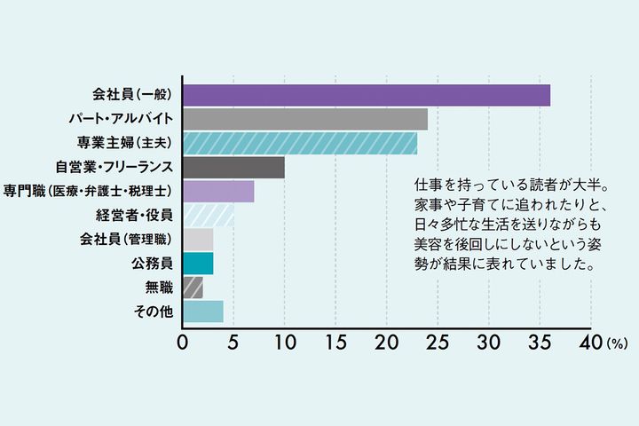 仕事を持っている読者が大半。家事や子育てに追われたりと、日々多忙な生活を送りながらも美容を後回しにしないという姿勢が結果に表れていました。