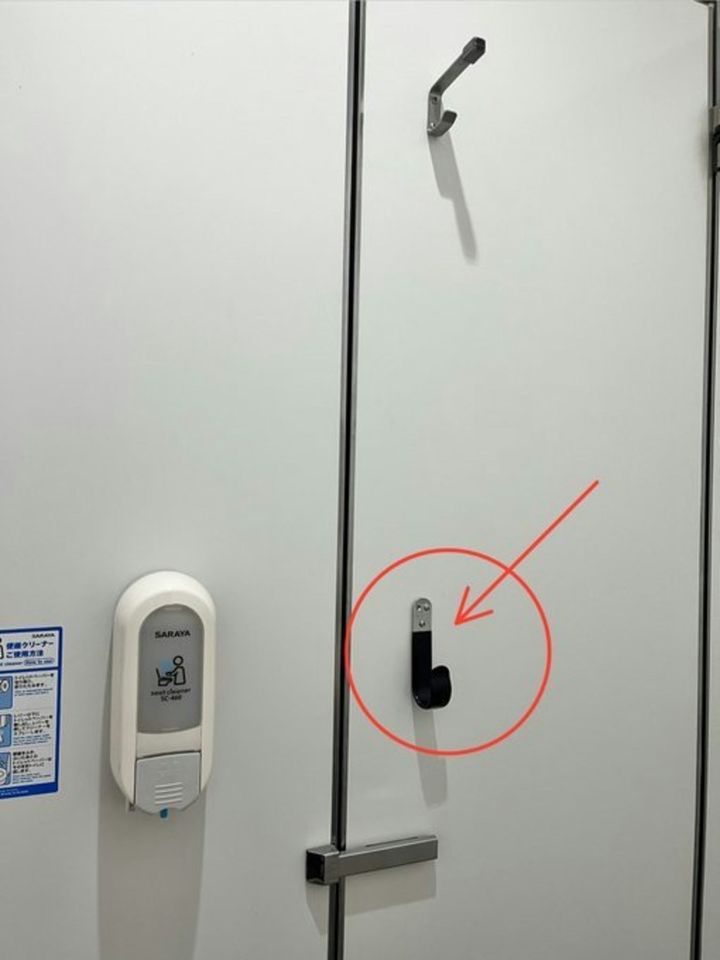 ショッピングの途中、トイレに行きたくなることありますよね。でも買い物袋は重いし、床には置きたくない…そんなとき、個室のドアを閉めて目に入ったのがドアの下の方にあるフックです。これはとても画期的。フックが下にあるだけで気持ちが変わりますね。