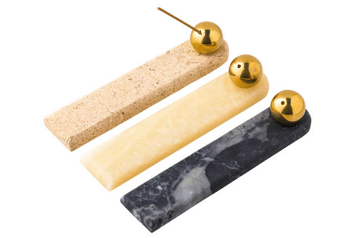 天然大理石をカットしたトレイ。石ならではの重厚感とひんやりとした質感でありながら、表面の模様や丸みのあるフォルムが優雅。取り外し可能な真鍮製の球体は、置き方ひとつで角度を変えられるため、長さの異なるインセンスにも対応できる。しっかり幅がある設計で、灰が外に落ちにくい。
