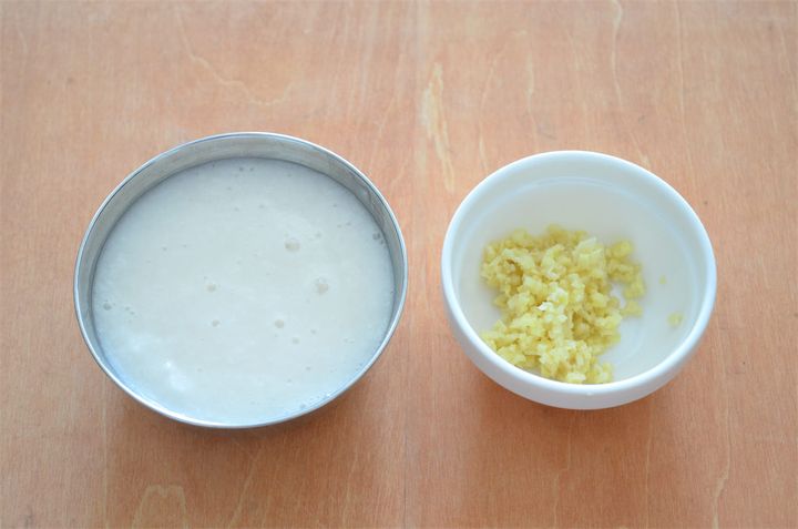 1. 一晩水に浸け戻しておいた大豆を粗めに刻み、長芋は皮を剥いてすりおろし、しょうがはみじん切りにしておく。