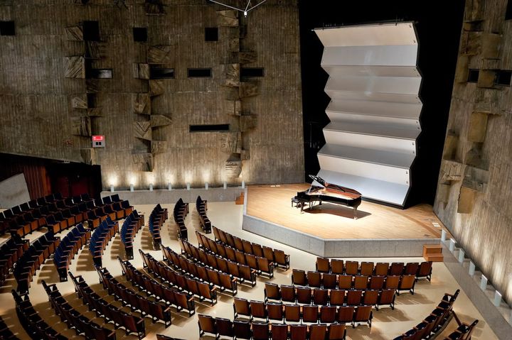 コンクリート壁に流政之の作品を合わせた649席の小ホールは2階に、地下には楽屋やリハーサル室が入る。この他、3階と4階には音楽資料室、大小の会議室がレイアウトされた。