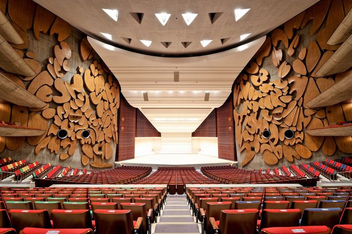 コンクリート打ちっぱなしの庇を3面に張り巡らせた重厚な外観に目をやりながら内部に入ると、巨木のような柱に支えられた内部空間が広がる。その先には、星空に見立て、不規則に照明をちりばめたホワイエが。オペラやバレエも上演できるよう設計された大ホールへの期待を高める。