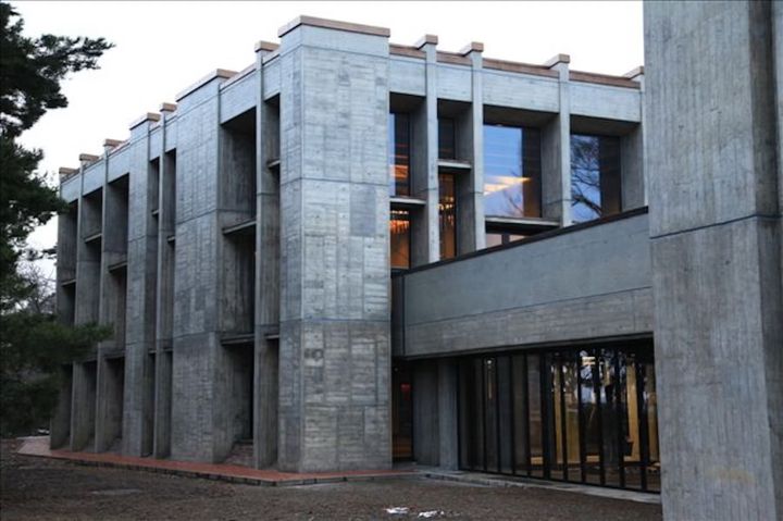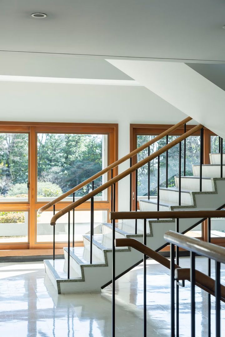1954年に着工し、建設中にはヴァルター・グロピウスも来日した。竣工は、1995年5月。コンクリート仕上げながら、杉板型枠を用いたことにより浮かび上がる木目や、水平に連続する窓を彩る木製サッシが、日本庭園と調和する。