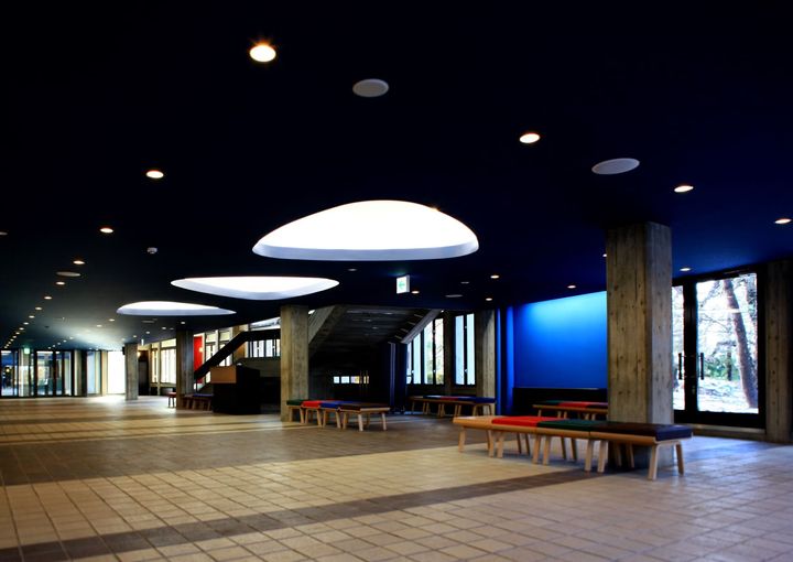 <写真>ホール棟のベンチも、前川が手がけたもの。「おにぎり型」の照明は後から設置された。