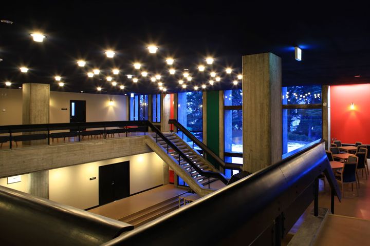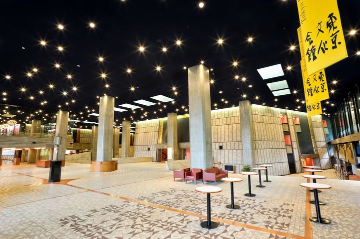 ホール棟とピロティ形式の車寄せ棟を介してつながる管理棟の内部は、近年の改修で天井の色を、群青色からもっと濃い「成層圏ブルー」に変更。東京文化会館でも試された星空のような天井の照明のイメージが強調された。