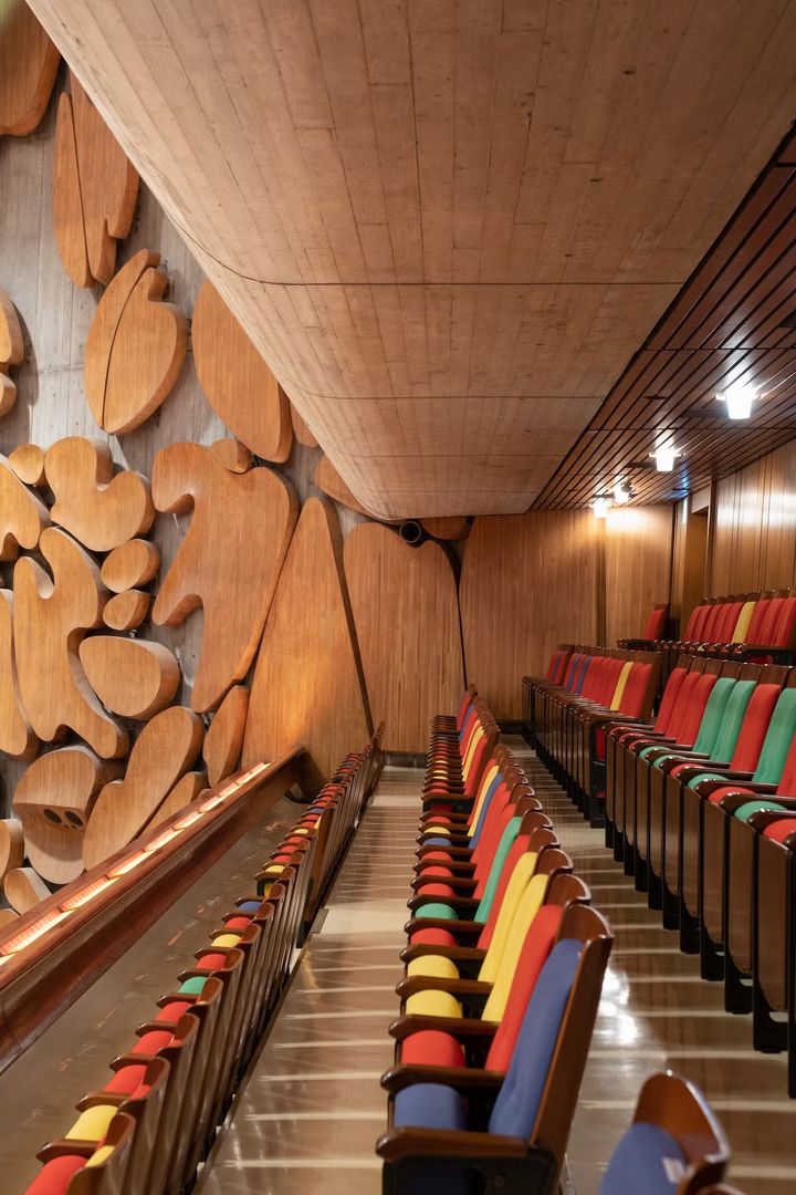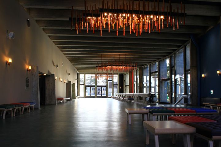 内部の各所で見られる、かまぼこ(ヴォールト)天井は、鉄骨の骨組みに短冊状のパネルをつり下げて固定する工法で実現。温かみのある色は、インド砂岩によるもの。カラフルな色の椅子やスツールも、オリジナルの色が再現されている。