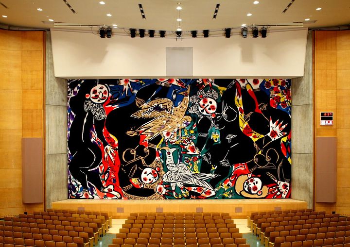 <写真>大ホールで存在感を放つ、棟方志功の緞帳《御鷹揚ゲノ妃々達々》