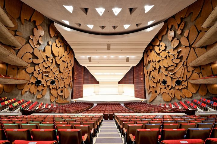 5階建て2303席の大ホール。舞台脇の壁面に設置されている印象的な木製の反射板は、彫刻家、向井良吉によるもの。
