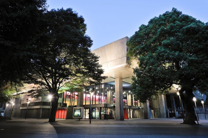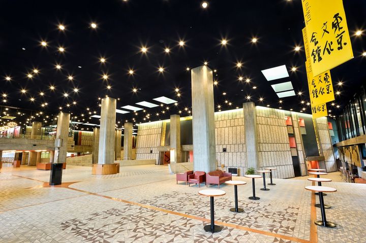 ホール棟とピロティ形式の車寄せ棟を介してつながる管理棟の内部は、近年の改修で天井の色を、群青色からもっと濃い「成層圏ブルー」に変更。「東京文化会館」でも試された星空のような天井の照明のイメージが強調された。(※写真は改修直後(2014年1月)に撮影したもの)