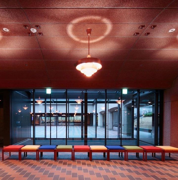 内部の各所で見られる、かまぼこ(ヴォールト)天井は、鉄骨の骨組みに短冊状のパネルをつり下げて固定する工法で実現。温かみのある色は、インド砂岩によるもの。カラフルな色の椅子やスツールも、オリジナルの色が再現されている。