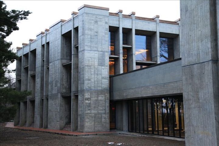 1954年に着工し、建設中にはヴァルター・グロピウスも来日した。竣工は、1955年6月。コンクリート仕上げながら、杉板型枠を用いたことにより浮かび上がる木目や、水平に連続する窓を彩る木製サッシが、日本庭園と調和する。