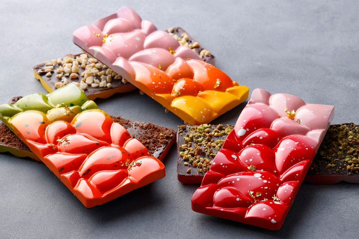 タブレットアートショコラは、味わいを色彩のグラデーションで表現したアートな3種がお目見え。ピーチとマンゴーの味わいにレモンがほのかに香る「ペッシュ」、柑橘の鮮やかな味わいをライムが引き立てる「アグリューム」、そしてローズの香りとグリオットチェリーや3種のベリーの甘酸っぱさが調和する「クール・ロゼ」を取り揃え、視覚と味覚で楽しむ華やかなひとときを演出する。