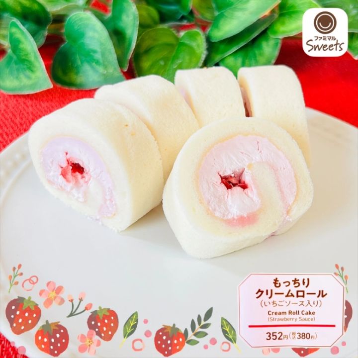 ファミマから登場している注目のいちごスイーツは「もっちりクリームロール(いちごソース入り)」♡真っ白でもちもちふわふわの生地に、ほんのりピンク色のいちごクリームといちごソースが入ったロールケーキ風のスイーツです。