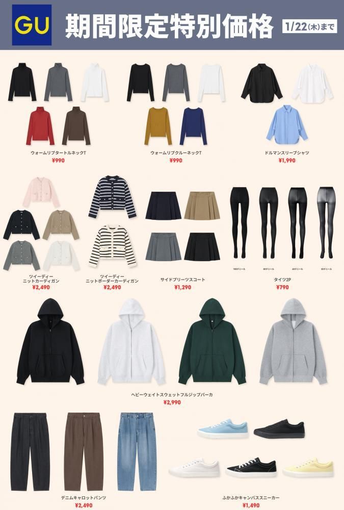 GU(ジーユー)は、2026年1月16日から22日までの期間限定で、一部のアイテムをお得な特別価格で販売しています。