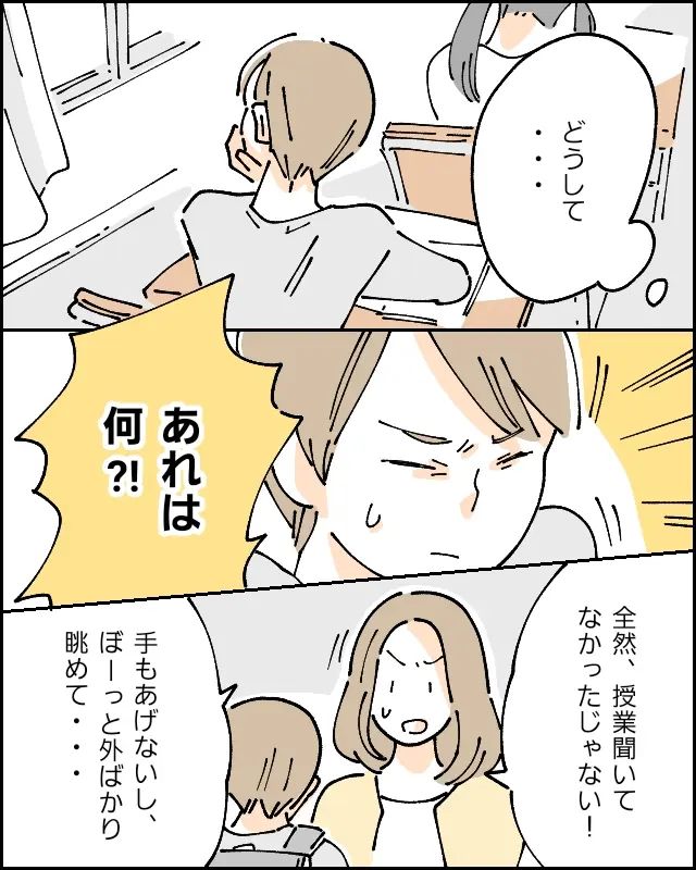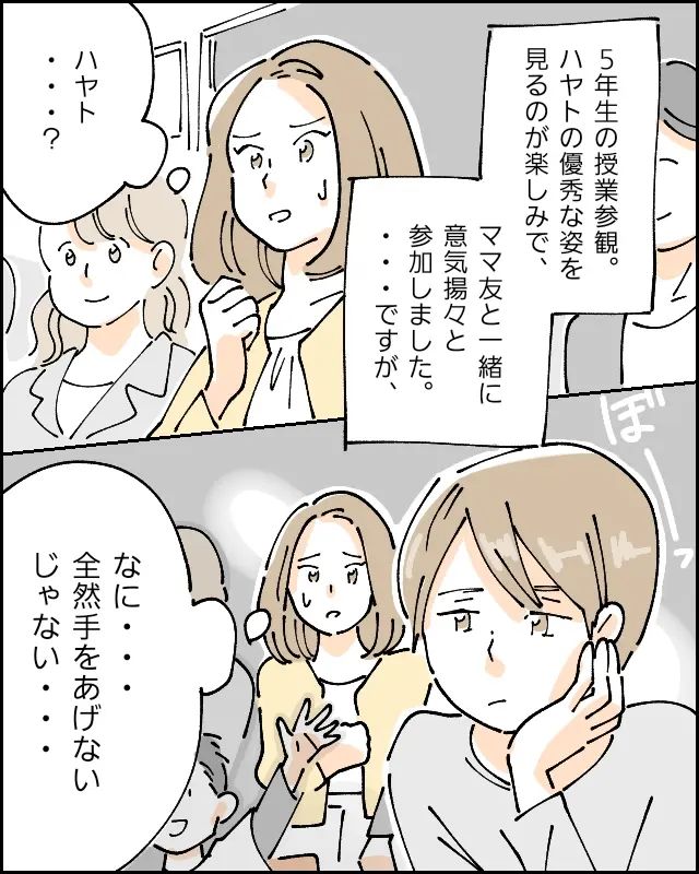 そしてこの日は5年生の授業参観でした。ハヤトの優秀な姿を見るのが楽しみで、ママ友と一緒に意気揚々と参加したのですが・・「ハヤト・・?」後ろから見ていても明らかにぼーっとしている様子。先生の話をちゃんと聞いているのかいないのか・・「なに・・全然手をあげないじゃない・・」私はどんどん不安になりました。