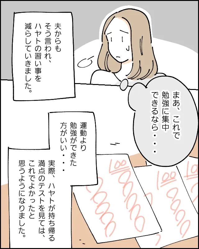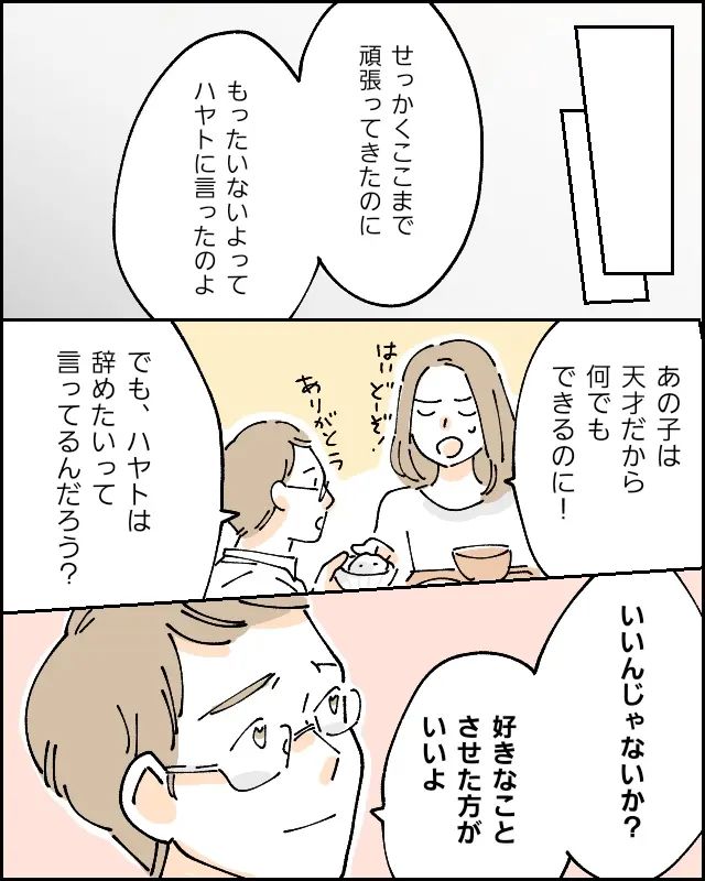 「せっかくここまで頑張ってきたのにもったいないよってハヤトに言ったのよ。あの子は天才だから何でもできるのに!」食事を席で夫に愚痴をこぼすと、「でも、ハヤトは辞めたいって言ってるんだろう?」と冷静な夫にそう言われ、「いいんじゃないか?好きなことさせた方がいいよ」夫はハヤトの気持ちに寄り添って、習い事を辞めさせた方が良いと言いました。