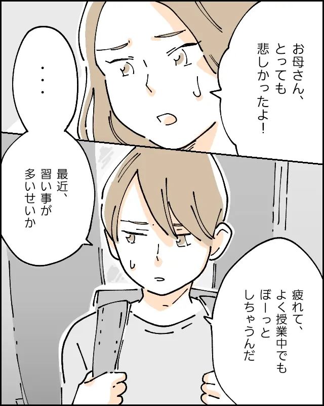 「お母さん、とっても悲しかったよ!」私がそう言うと、「・・最近、習い事が多いせいか、疲れて、よく授業中ぼーっとしちゃうんだ」と言った後、