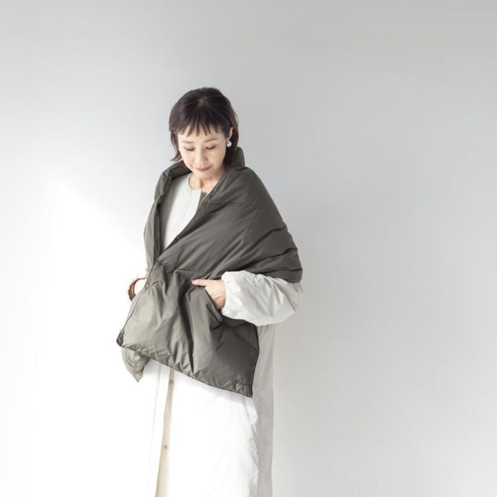 朝晩と日中で寒暖差があるときなど、薄手のコートの上からベストにもなる中綿マフラーを巻くのもおすすめ。