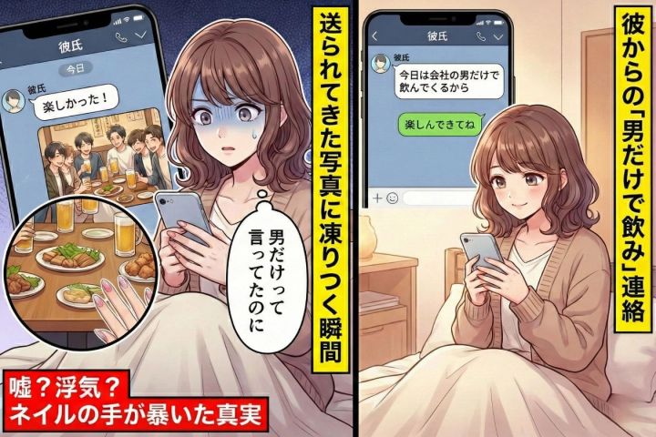 「男だけの飲み会だから」という言葉を信じていた私に届いた、一枚の集合写真。何気なく眺めていた画面の端に、あろうことか「見覚えのないネイル」が映り込んでいました...。