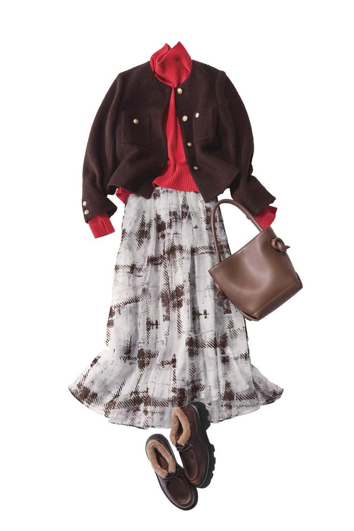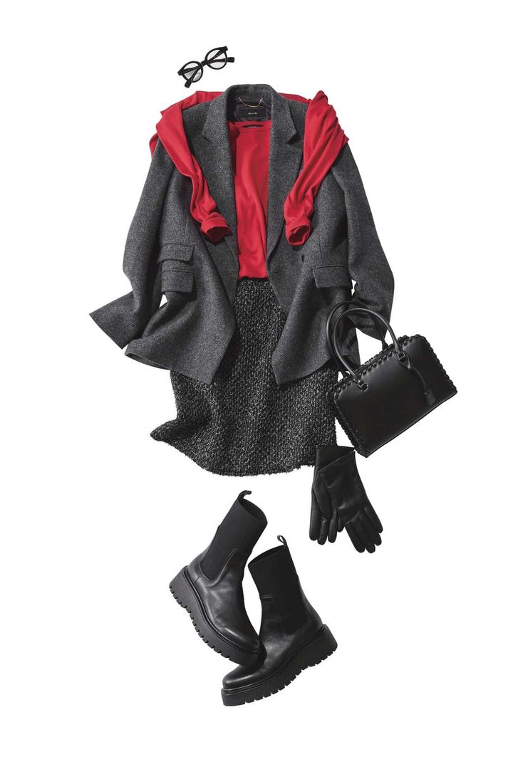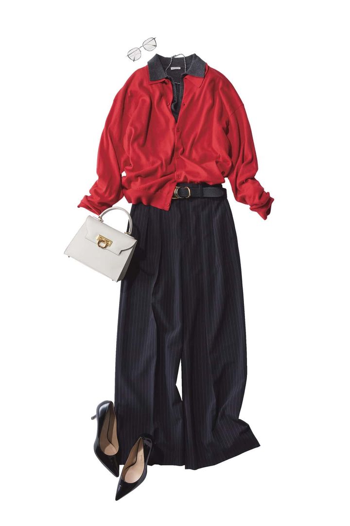 アクセントの赤ニットをレイヤードしつつ、似たトーンの色を重ねることでコーデに奥行きが出て説得力UP。構築的な重ね着で洗練されたこなれ感を。