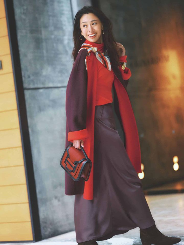全体を同系色でまとめることでコントラストが和らぎ、ビビットな赤も浮かず落ち着いたな印象に。小物も同様に同系色でまとめることでコーデに統一感が出て、上品な“映え”コーデに仕上がります。