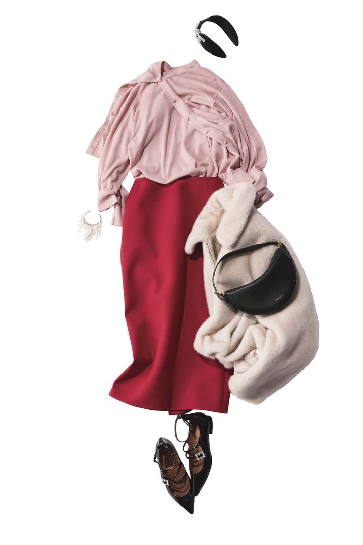 くすみピンクと深い赤は、感度抜群な色合わせ。互いに深い色味だから、シックな印象で仕上がります。感度高めのカラーコーデも品よくロマンティックに。パールやファーブルゾンで女性らしさを。