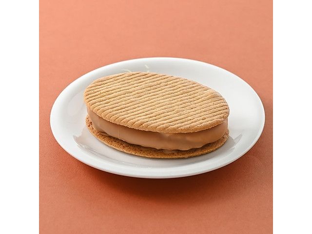キャラメルソースをキャラメルクリームで包み、パリッとしたキャラメルコーティングをかけ、サクサク食感のビスケット生地でサンドしました。